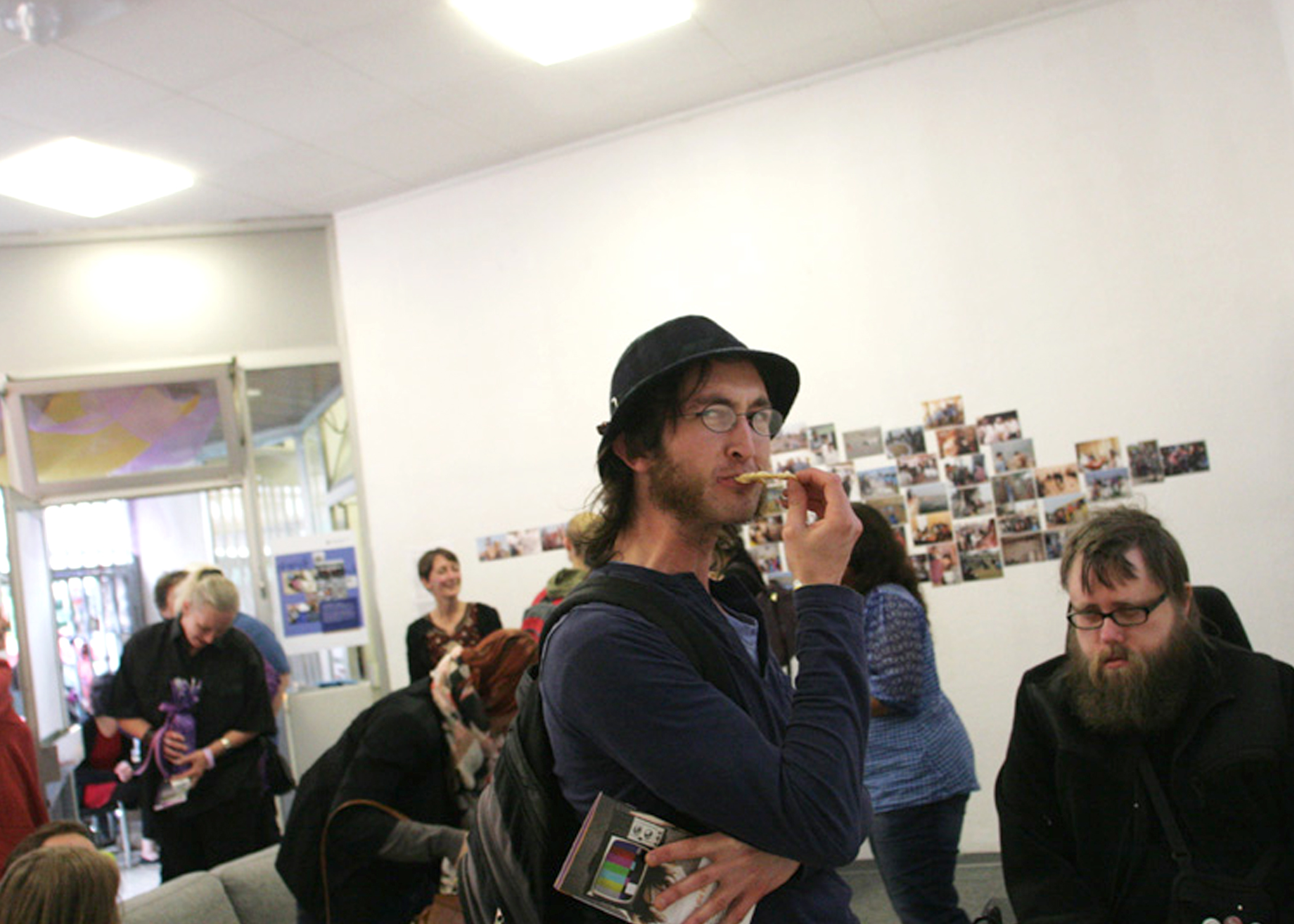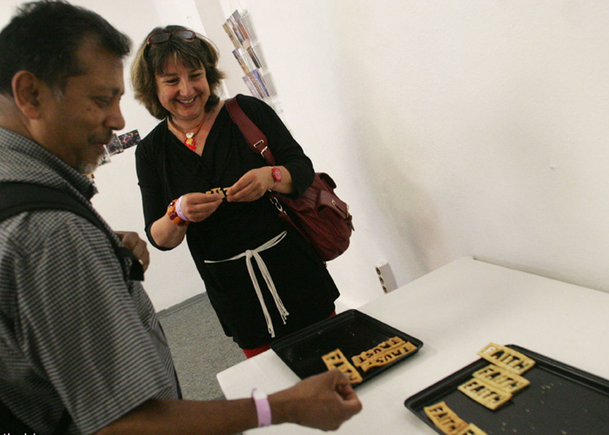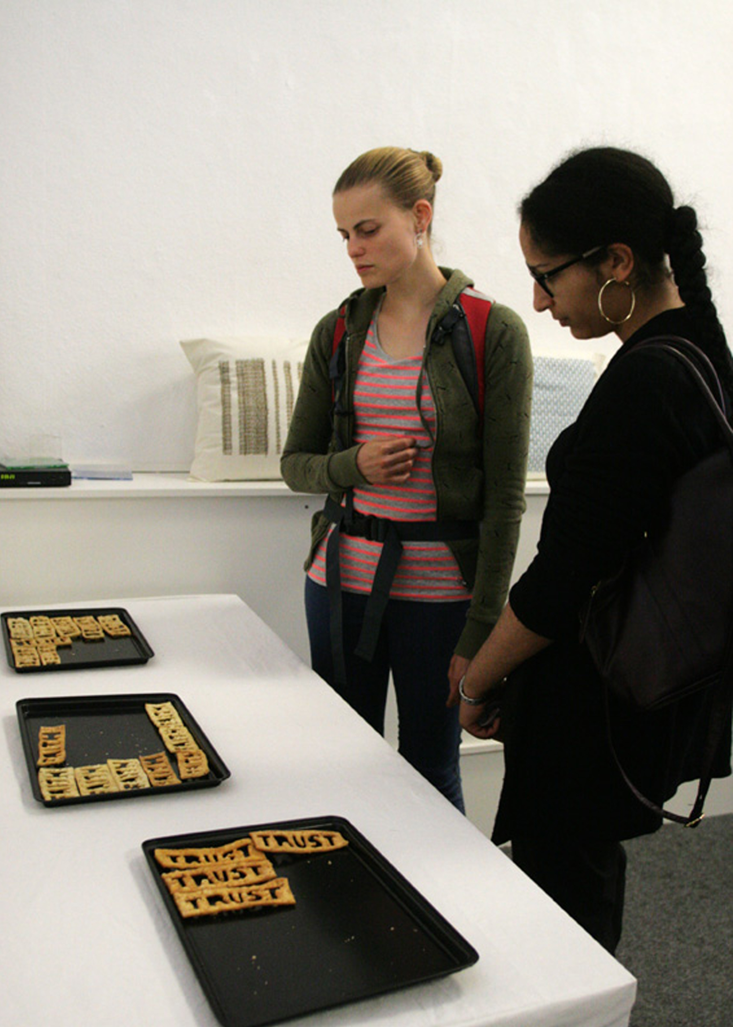 The food performance dealt with the simple idea of sharing. Hand made crackers were made which read Faith, Trust, and Belief, and were offered to the incoming viewers, inviting them to share the qualities by eating them.